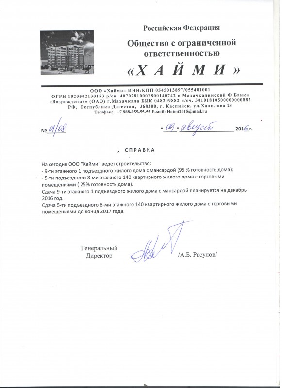 Мы приглашаем инвесторов вкладывать средства в строительство наших домов, чтобы новосёлы получили радость от вселения в новые квартиры, возможно, первые в их жизни, и стали счастливыми жителями Каспийска. Для получения квартир готов пакет документов от градостроительных организаций и учреждений, потому что мы работаем с полным соблюдением действующих норм и государственных законов.